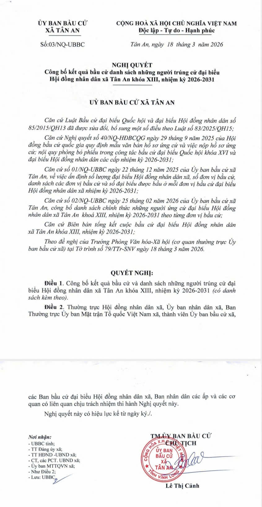 Công bố kết quả bầu cử danh sách những ngưòi trúng cử đại biểu Hội đồng nhân dân xã Tân An khóa XIII, nhiệm kỳ 2026-2031